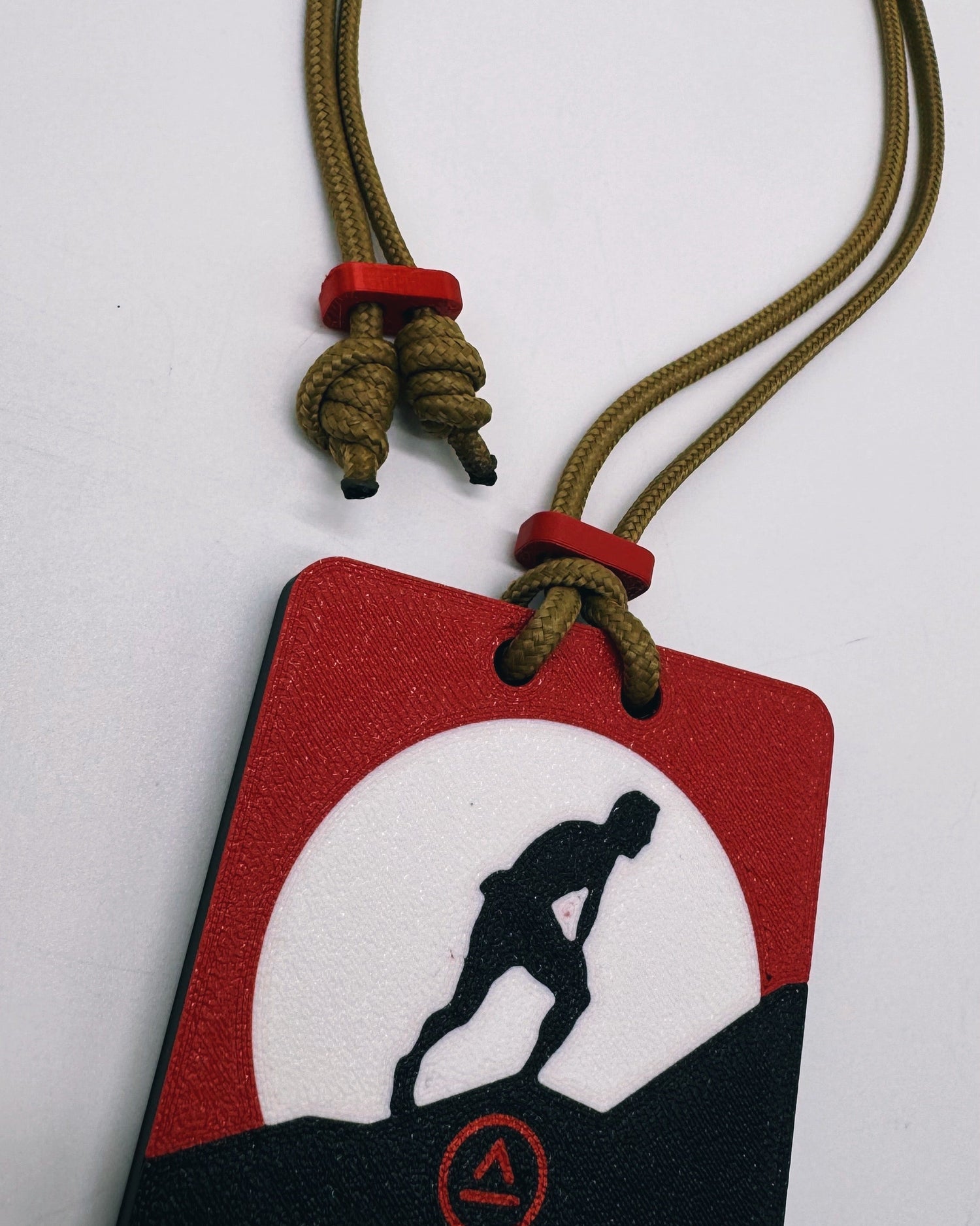 The medal’s smooth face-down finish is a clean micro-texture straight off the build plate — no sanding, no glitter. Durable, crisp, and ready for miles more adventures (the paracord is reusable, too).